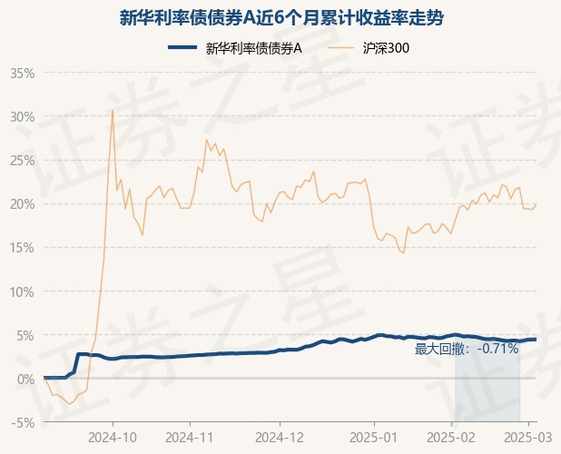 证券之星消息,3月5日,新华利率债债券A最新单位净值为1.1003元,累计净值为1.1434元,较前一交易日上涨0.03%。历史数据显示该基金近1个月下跌0.42%,近3个月上涨1.15%,近6个月上涨4.41%,近1年上涨4.93%。该基金近6个月的累计收益率走势如下图: