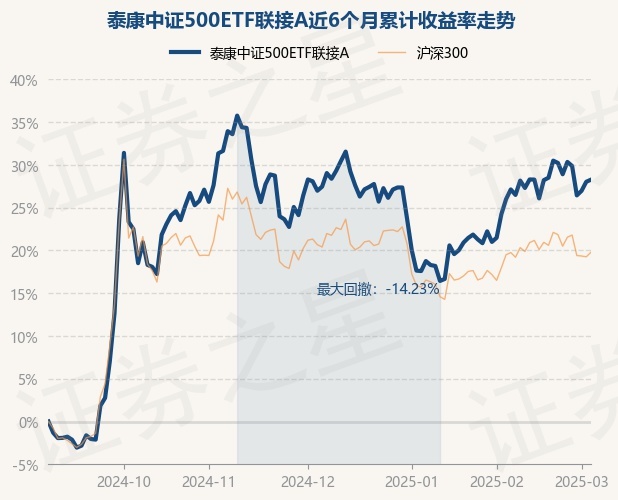 证券之星消息,3月5日,泰康中证500ETF联接A最新单位净值为0.9453元,累计净值为0.9453元,较前一交易日上涨0.19%。历史数据显示该基金近1个月上涨5.58%,近3个月上涨0.64%,近6个月上涨28.26%,近1年上涨12.28%。该基金近6个月的累计收益率走势如下图: