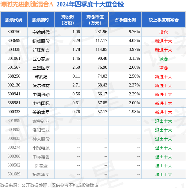 博时先进制造混合A为混合型-偏股基金,根据最新一期基金季报显示,该基金资产配置:股票占净值比78.24%,债券占净值比2.05%,现金占净值比17.8%。基金十大重仓股如下:
