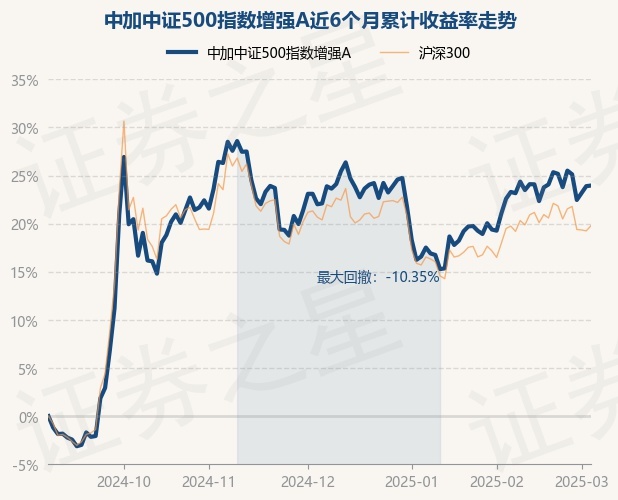 证券之星消息,3月5日,中加中证500指数增强A最新单位净值为0.968元,累计净值为0.968元,较前一交易日上涨0.05%。历史数据显示该基金近1个月上涨3.93%,近3个月上涨1.52%,近6个月上涨23.96%,近1年上涨10.72%。该基金近6个月的累计收益率走势如下图:
