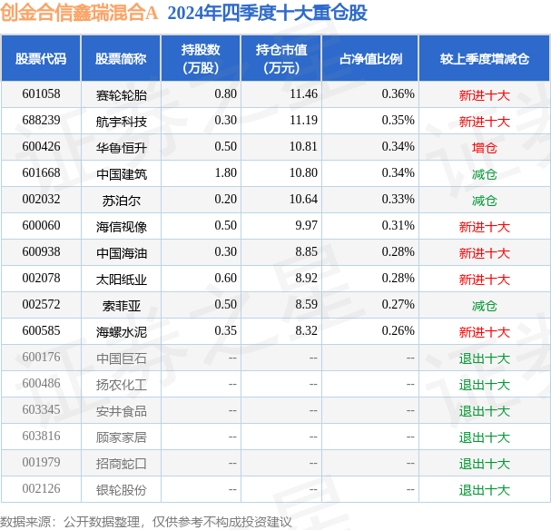 创金合信鑫瑞混合A为混合型-偏债基金,根据最新一期基金季报显示,该基金资产配置:股票占净值比4.24%,债券占净值比90.39%,现金占净值比1.65%。基金十大重仓股如下: