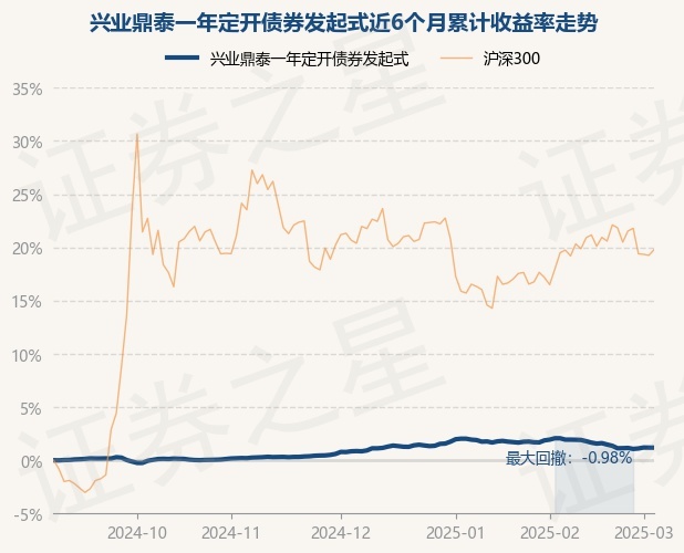 证券之星消息,3月5日,兴业鼎泰一年定开债券发起式最新单位净值为1.0105元,累计净值为1.1424元,较前一交易日上涨0.0%。历史数据显示该基金近1个月下跌0.72%,近3个月上涨0.34%,近6个月上涨1.21%,近1年上涨2.85%。该基金近6个月的累计收益率走势如下图: