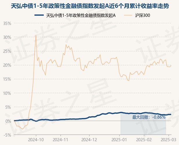 证券之星消息,3月5日,天弘中债1-5年政策性金融债指数发起A最新单位净值为1.0577元,累计净值为1.1395元,较前一交易日上涨0.03%。历史数据显示该基金近1个月下跌0.54%,近3个月上涨0.84%,近6个月上涨2.25%,近1年上涨4.87%。该基金近6个月的累计收益率走势如下图: