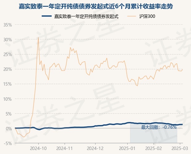 证券之星消息,3月5日,嘉实致泰一年定开纯债债券发起式最新单位净值为1.0399元,累计净值为1.0795元,较前一交易日上涨0.02%。历史数据显示该基金近1个月下跌0.47%,近3个月上涨0.42%,近6个月上涨1.26%,近1年上涨3.3%。该基金近6个月的累计收益率走势如下图: