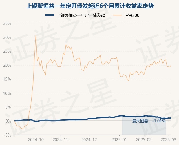 证券之星消息,3月5日,上银聚恒益一年定开债发起最新单位净值为1.0031元,累计净值为1.0725元,较前一交易日上涨0.03%。历史数据显示该基金近1个月下跌0.66%,近3个月上涨0.14%,近6个月上涨0.95%,近1年上涨2.6%。该基金近6个月的累计收益率走势如下图: