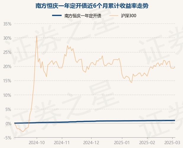 证券之星消息,3月5日,南方恒庆一年定开债最新单位净值为1.0278元,累计净值为1.1105元,较前一交易日上涨0.0%。历史数据显示该基金近1个月上涨0.08%,近3个月上涨0.27%,近6个月上涨0.97%,近1年上涨2.13%。该基金近6个月的累计收益率走势如下图: