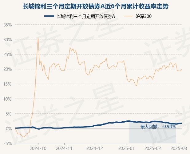 证券之星消息,3月5日,长城锦利三个月定期开放债券A最新单位净值为1.0537元,累计净值为1.0537元,较前一交易日上涨0.03%。历史数据显示该基金近1个月下跌0.58%,近3个月上涨0.56%,近6个月上涨1.62%,近1年上涨3.66%。该基金近6个月的累计收益率走势如下图: