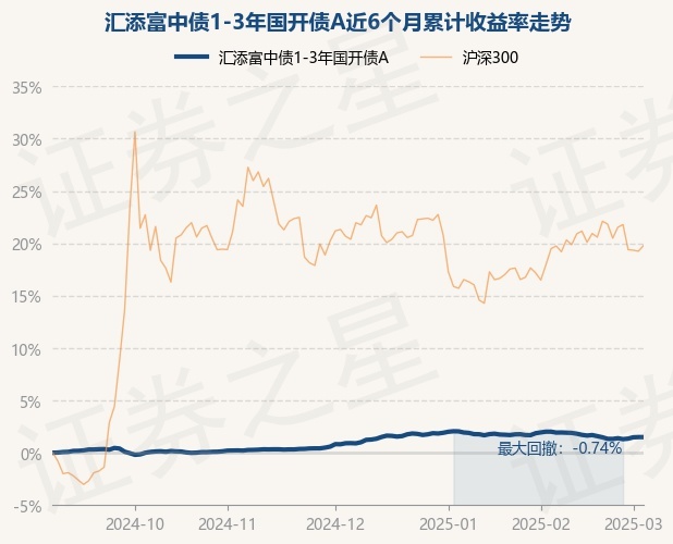 证券之星消息,3月5日,汇添富中债1-3年国开债A最新单位净值为1.0375元,累计净值为1.1917元,较前一交易日上涨0.0%。历史数据显示该基金近1个月下跌0.44%,近3个月上涨0.57%,近6个月上涨1.5%,近1年上涨3.51%。该基金近6个月的累计收益率走势如下图: