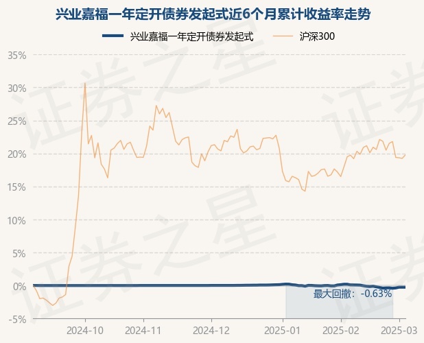 证券之星消息,3月5日,兴业嘉福一年定开债券发起式最新单位净值为1.0638元,累计净值为1.1624元,较前一交易日上涨0.0%。历史数据显示该基金近1个月下跌0.38%,近3个月下跌0.27%,近6个月下跌0.26%,近1年上涨5.51%。该基金近6个月的累计收益率走势如下图: