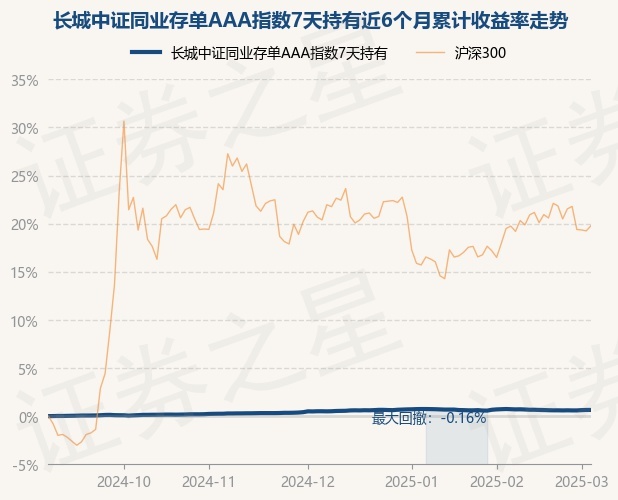 证券之星消息,3月5日,长城中证同业存单AAA指数7天持有最新单位净值为1.0463元,累计净值为1.0463元,较前一交易日上涨0.0%。历史数据显示该基金近1个月下跌0.06%,近3个月上涨0.13%,近6个月上涨0.64%,近1年上涨1.61%。该基金近6个月的累计收益率走势如下图: