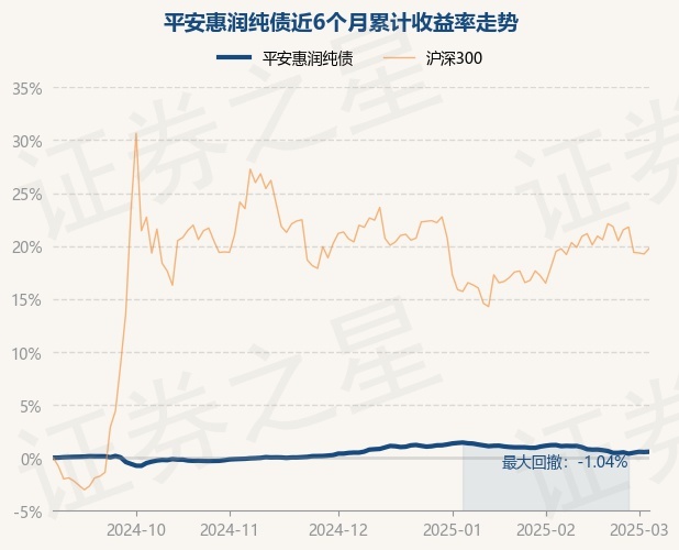 证券之星消息,3月5日,平安惠润纯债最新单位净值为1.0342元,累计净值为1.1432元,较前一交易日上涨0.03%。历史数据显示该基金近1个月下跌0.56%,近3个月上涨0.08%,近6个月上涨0.57%,近1年上涨1.75%。该基金近6个月的累计收益率走势如下图: