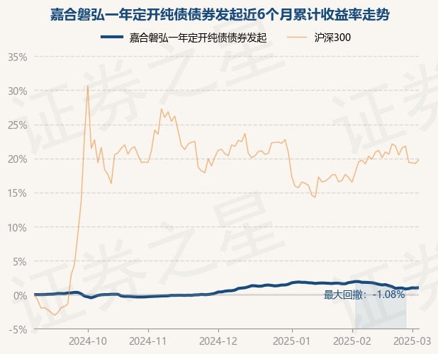 证券之星消息,3月5日,嘉合磐弘一年定开纯债债券发起最新单位净值为1.0574元,累计净值为1.0684元,较前一交易日上涨0.05%。历史数据显示该基金近1个月下跌0.8%,近3个月上涨0.46%,近6个月上涨1.02%,近1年上涨2.83%。该基金近6个月的累计收益率走势如下图: