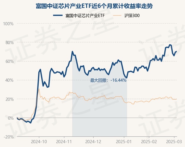证券之星消息,3月5日,富国中证芯片产业ETF最新单位净值为0.8235元,累计净值为0.8235元,较前一交易日上涨0.41%。历史数据显示该基金近1个月上涨10.48%,近3个月上涨12.98%,近6个月上涨70.18%,近1年上涨48.08%。该基金近6个月的累计收益率走势如下图: