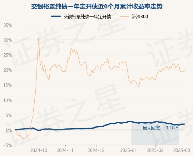 证券之星消息,3月5日,交银裕景纯债一年定开债最新单位净值为1.0448元,累计净值为1.1168元,较前一交易日上涨0.04%。历史数据显示该基金近1个月下跌0.72%,近3个月上涨0.8%,近6个月上涨1.9%,近1年上涨3.66%。该基金近6个月的累计收益率走势如下图: