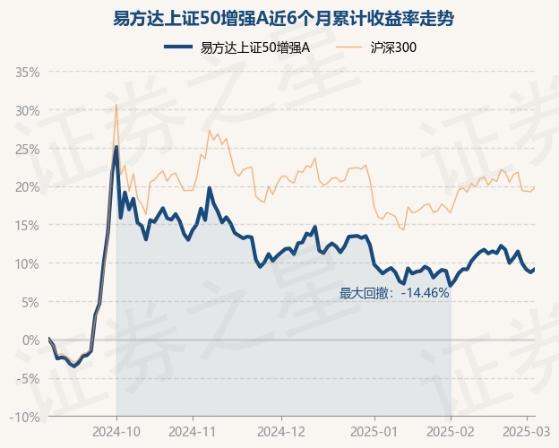 证券之星消息,3月5日,易方达上证50增强A最新单位净值为1.7995元,累计净值为3.7895元,较前一交易日上涨0.38%。历史数据显示该基金近1个月上涨2.02%,近3个月下跌1.75%,近6个月上涨9.17%,近1年上涨1.55%。该基金近6个月的累计收益率走势如下图: