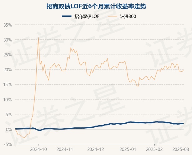 证券之星消息,3月5日,招商双债LOF最新单位净值为1.5947元,累计净值为1.7337元,较前一交易日上涨0.02%。历史数据显示该基金近1个月下跌0.47%,近3个月上涨0.75%,近6个月上涨1.82%,近1年上涨3.68%。该基金近6个月的累计收益率走势如下图: