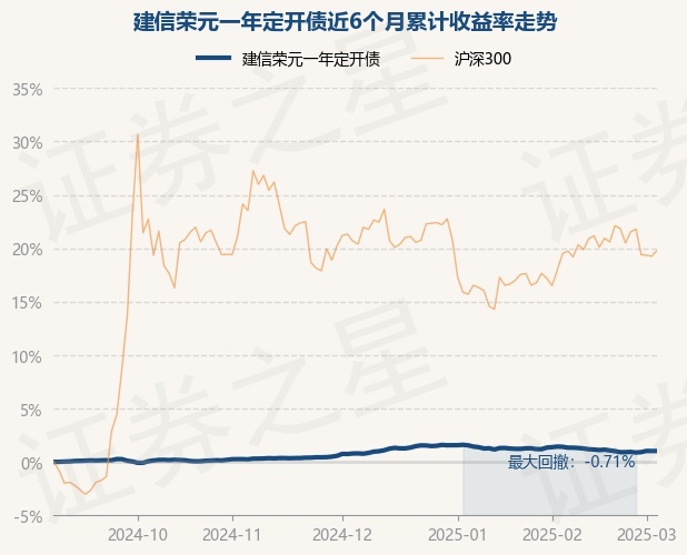 证券之星消息,3月5日,建信荣元一年定开债最新单位净值为1.0904元,累计净值为1.1354元,较前一交易日上涨0.01%。历史数据显示该基金近1个月下跌0.35%,近3个月上涨0.23%,近6个月上涨1.03%,近1年上涨2.84%。该基金近6个月的累计收益率走势如下图: