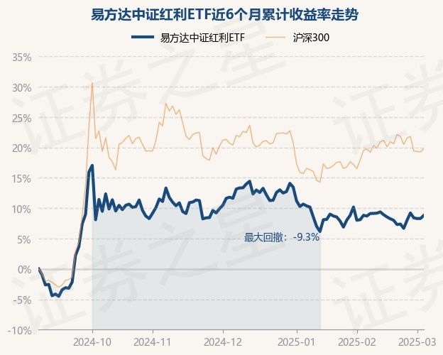证券之星消息,3月5日,易方达中证红利ETF最新单位净值为1.3219元,累计净值为1.5929元,较前一交易日上涨0.47%。历史数据显示该基金近1个月上涨0.74%,近3个月下跌2.52%,近6个月上涨8.77%,近1年上涨2.74%。该基金近6个月的累计收益率走势如下图: