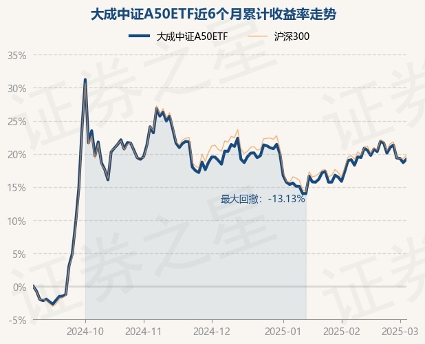证券之星消息,3月5日,大成中证A50ETF最新单位净值为1.1392元,累计净值为1.1392元,较前一交易日上涨0.44%。历史数据显示该基金近1个月上涨2.89%,近3个月上涨0.64%,近6个月上涨19.2%。该基金近6个月的累计收益率走势如下图: