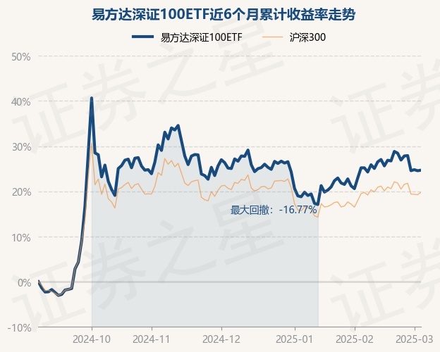证券之星消息,3月5日,易方达深证100ETF最新单位净值为2.7788元,累计净值为5.3908元,较前一交易日上涨0.1%。历史数据显示该基金近1个月上涨3.39%,近3个月下跌0.29%,近6个月上涨24.68%,近1年上涨13.04%。该基金近6个月的累计收益率走势如下图: