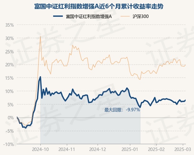 证券之星消息,3月5日,富国中证红利指数增强A最新单位净值为0.944元,累计净值为3.175元,较前一交易日上涨0.43%。历史数据显示该基金近1个月上涨0.84%,近3个月下跌1.71%,近6个月上涨6.48%,近1年下跌0.26%。该基金近6个月的累计收益率走势如下图: