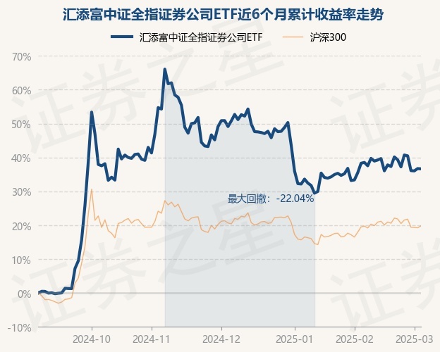 证券之星消息,3月5日,汇添富中证全指证券公司ETF最新单位净值为1.1943元,累计净值为1.1943元,较前一交易日下跌0.05%。历史数据显示该基金近1个月上涨2.46%,近3个月下跌9.39%,近6个月上涨36.65%,近1年上涨21.9%。该基金近6个月的累计收益率走势如下图: