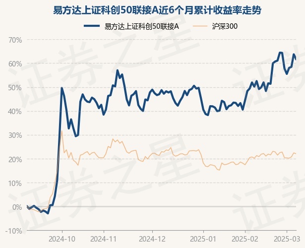 证券之星消息,3月6日,易方达上证科创50联接A最新单位净值为0.8707元,累计净值为0.8707元,较前一交易日上涨3.31%。历史数据显示该基金近1个月上涨10.37%,近3个月上涨10.09%,近6个月上涨63.73%,近1年上涨35.33%。该基金近6个月的累计收益率走势如下图: