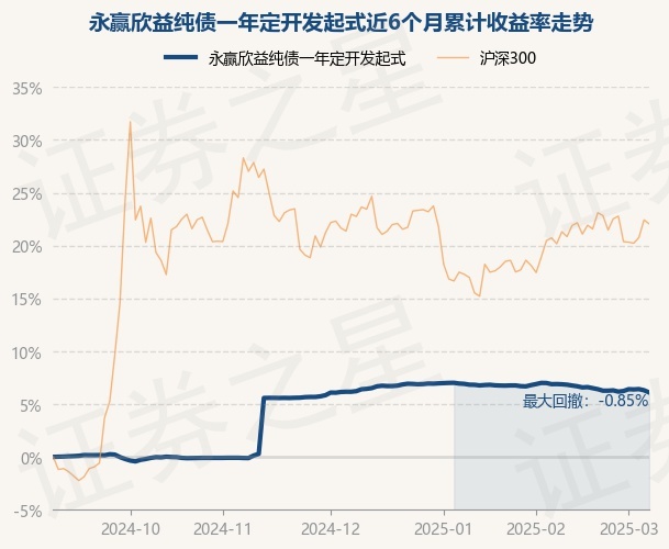 证券之星消息,3月6日,永赢欣益纯债一年定开发起式最新单位净值为1.0699元,累计净值为1.2197元,较前一交易日下跌0.1%。历史数据显示该基金近1个月下跌0.65%,近3个月上涨0.13%,近6个月上涨6.31%,近1年上涨8.56%。该基金近6个月的累计收益率走势如下图: