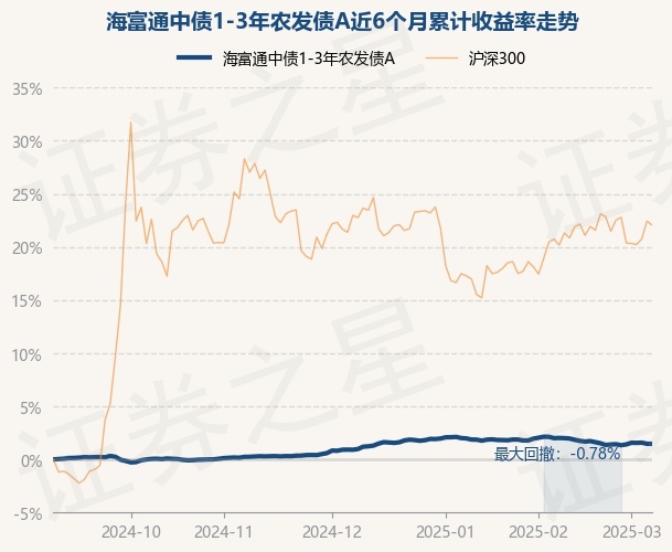 证券之星消息,3月6日,海富通中债1-3年农发债A最新单位净值为1.0683元,累计净值为1.1323元,较前一交易日上涨0.0%。历史数据显示该基金近1个月下跌0.65%,近3个月上涨0.56%,近6个月上涨1.47%,近1年上涨3.67%。该基金近6个月的累计收益率走势如下图: