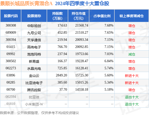 景顺长城品质长青混合A为混合型-偏股基金,根据最新一期基金季报显示,该基金资产配置:股票占净值比88.59%,无债券类资产,现金占净值比17.49%。基金十大重仓股如下: