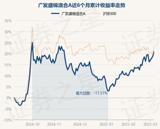 证券之星消息,3月6日,广发盛锦混合A最新单位净值为0.5853元,累计净值为0.5853元,较前一交易日上涨1.7%。历史数据显示该基金近1个月上涨8.47%,近3个月上涨4.63%,近6个月上涨20.9%,近1年上涨5.69%。该基金近6个月的累计收益率走势如下图: