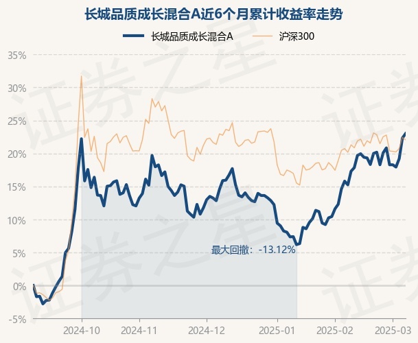 证券之星消息,3月6日,长城品质成长混合A最新单位净值为0.6364元,累计净值为0.6364元,较前一交易日上涨0.0%。历史数据显示该基金近1个月上涨8.94%,近3个月上涨6.8%,近6个月上涨22.34%,近1年上涨13.16%。该基金近6个月的累计收益率走势如下图: