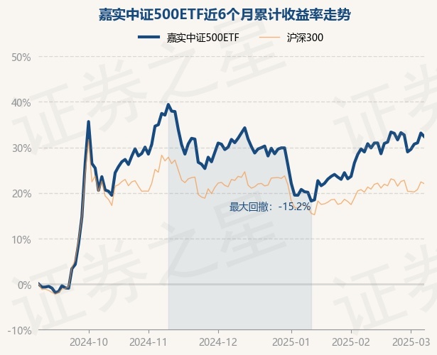 证券之星消息,3月6日,嘉实中证500ETF最新单位净值为2.4137元,累计净值为1.9917元,较前一交易日上涨1.64%。历史数据显示该基金近1个月上涨5.19%,近3个月上涨1.06%,近6个月上涨33.04%,近1年上涨14.56%。该基金近6个月的累计收益率走势如下图:
