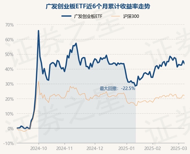 证券之星消息,3月6日,广发创业板ETF最新单位净值为1.3394元,累计净值为1.3394元,较前一交易日上涨2.02%。历史数据显示该基金近1个月上涨5.36%,近3个月下跌1.43%,近6个月上涨45.46%,近1年上涨23.52%。该基金近6个月的累计收益率走势如下图:
