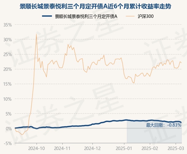 证券之星消息,3月7日,景顺长城景泰悦利三个月定开债A最新单位净值为1.0353元,累计净值为1.1179元,较前一交易日下跌0.22%。历史数据显示该基金近1个月下跌0.74%,近3个月上涨0.43%,近6个月上涨1.92%,近1年上涨4.81%。该基金近6个月的累计收益率走势如下图: