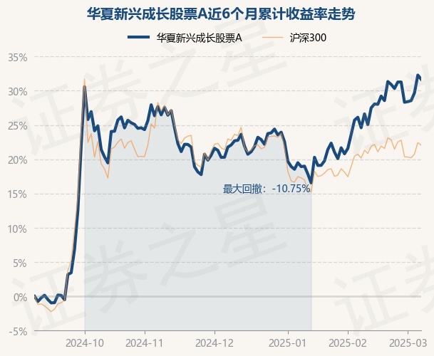 证券之星消息,3月7日,华夏新兴成长股票A最新单位净值为0.7807元,累计净值为0.7807元,较前一交易日下跌0.46%。历史数据显示该基金近1个月上涨4.75%,近3个月上涨8.13%,近6个月上涨31.67%,近1年上涨25.86%。该基金近6个月的累计收益率走势如下图: