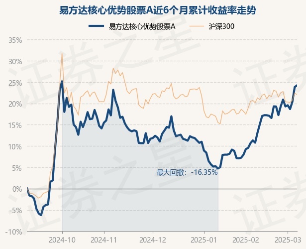 证券之星消息,3月7日,易方达核心优势股票A最新单位净值为0.764元,累计净值为0.764元,较前一交易日上涨0.32%。历史数据显示该基金近1个月上涨12.25%,近3个月上涨10.1%,近6个月上涨24.23%,近1年上涨12.75%。该基金近6个月的累计收益率走势如下图: