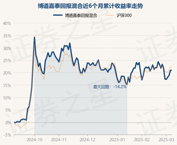 证券之星消息,3月7日,博道嘉泰回报混合最新单位净值为1.4885元,累计净值为1.4885元,较前一交易日上涨0.0%。历史数据显示该基金近1个月下跌1.09%,近3个月下跌3.06%,近6个月上涨20.21%,近1年上涨6.01%。该基金近6个月的累计收益率走势如下图: