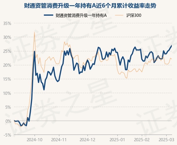 证券之星消息,3月7日,财通资管消费升级一年持有A最新单位净值为0.7507元,累计净值为0.7507元,较前一交易日上涨0.59%。历史数据显示该基金近1个月上涨4.53%,近3个月上涨5.41%,近6个月上涨26.89%,近1年上涨19.77%。该基金近6个月的累计收益率走势如下图: