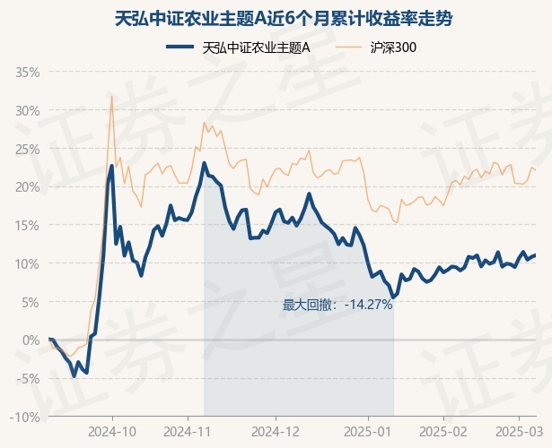 证券之星消息,3月7日,天弘中证农业主题A最新单位净值为0.6665元,累计净值为0.6665元,较前一交易日上涨0.2%。历史数据显示该基金近1个月上涨1.35%,近3个月下跌4.24%,近6个月上涨10.97%,近1年下跌2.57%。该基金近6个月的累计收益率走势如下图: