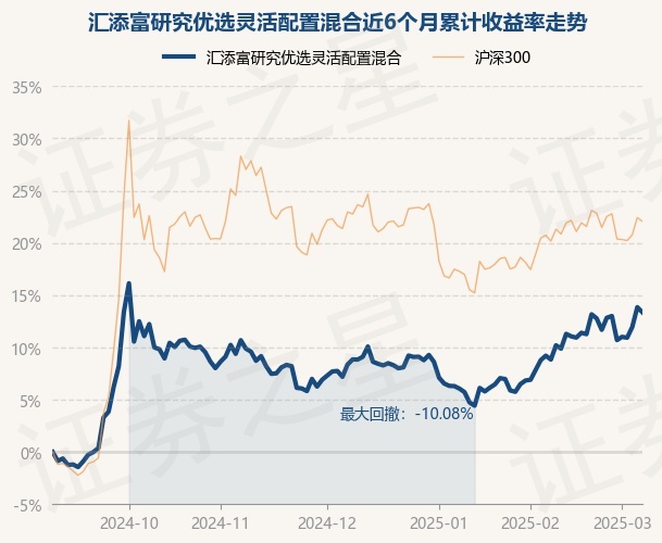 证券之星消息,3月7日,汇添富研究优选灵活配置混合最新单位净值为0.9555元,累计净值为1.2055元,较前一交易日下跌0.43%。历史数据显示该基金近1个月上涨4.21%,近3个月上涨4.61%,近6个月上涨13.36%,近1年上涨10.17%。该基金近6个月的累计收益率走势如下图: