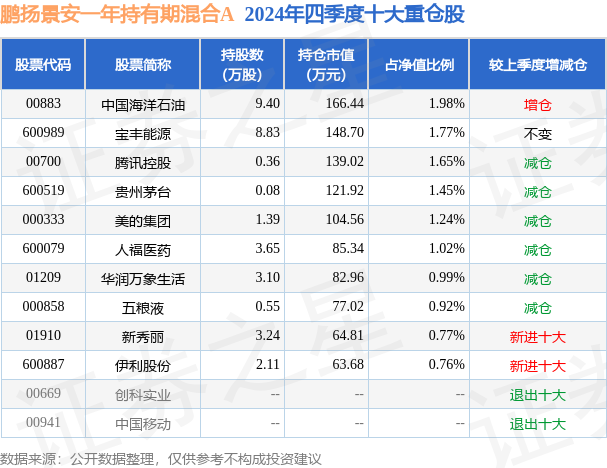 鹏扬景安一年持有期混合A为混合型-偏债基金,根据最新一期基金季报显示,该基金资产配置:股票占净值比21.09%,债券占净值比69.8%,现金占净值比9.17%。基金十大重仓股如下: