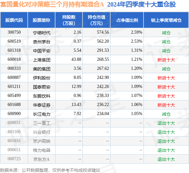 富国量化对冲策略三个月持有期混合A为混合型-绝对收益基金,根据最新一期基金季报显示,该基金资产配置:股票占净值比80.47%,债券占净值比1.5%,现金占净值比9.59%。基金十大重仓股如下: