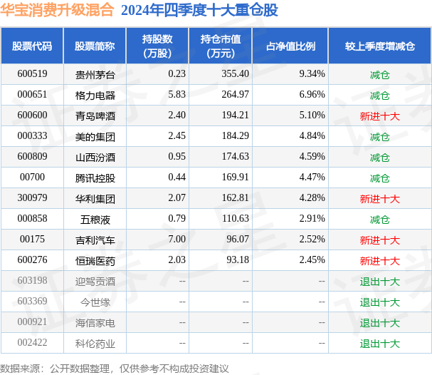 华宝消费升级混合为混合型-偏股基金,根据最新一期基金季报显示,该基金资产配置:股票占净值比93.08%,无债券类资产,现金占净值比7.3%。基金十大重仓股如下:
