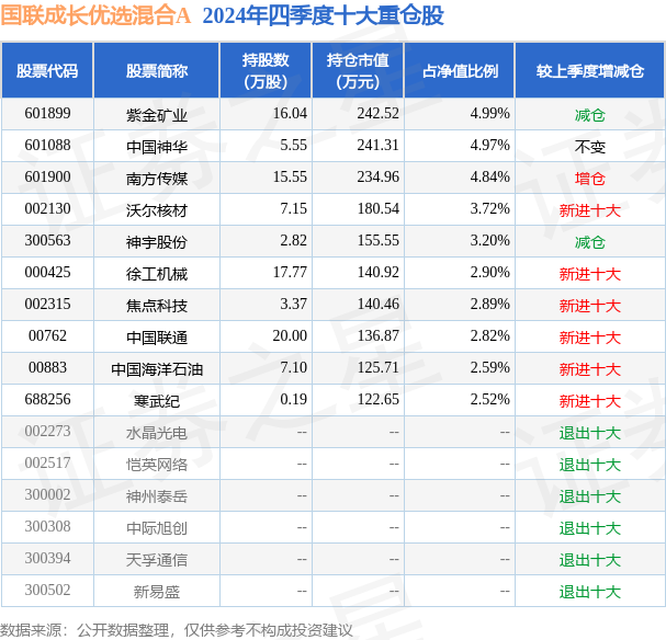 国联成长优选混合A为混合型-偏股基金,根据最新一期基金季报显示,该基金资产配置:股票占净值比89.7%,债券占净值比6.09%,现金占净值比3.85%。基金十大重仓股如下: