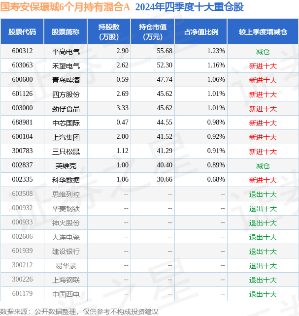 国寿安保璟珹6个月持有混合A为混合型-偏债基金,根据最新一期基金季报显示,该基金资产配置:股票占净值比9.85%,债券占净值比57.41%,现金占净值比10.25%。基金十大重仓股如下: