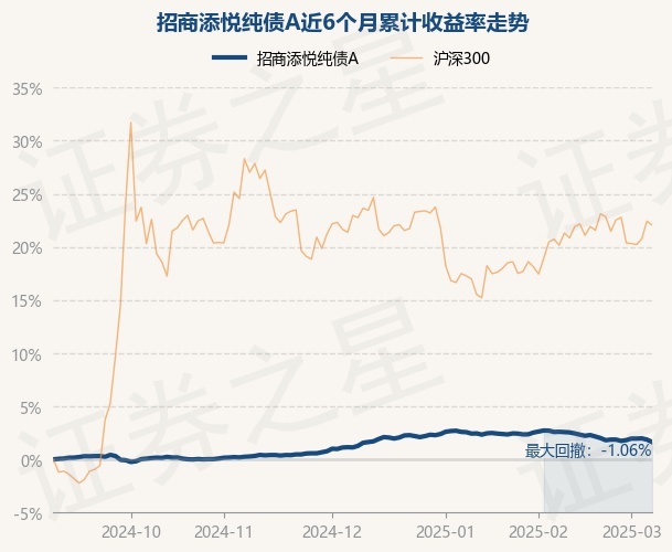 证券之星消息,3月7日,招商添悦纯债A最新单位净值为1.0483元,累计净值为1.2501元,较前一交易日下跌0.23%。历史数据显示该基金近1个月下跌1.05%,近3个月上涨0.5%,近6个月上涨1.64%,近1年上涨3.57%。该基金近6个月的累计收益率走势如下图: