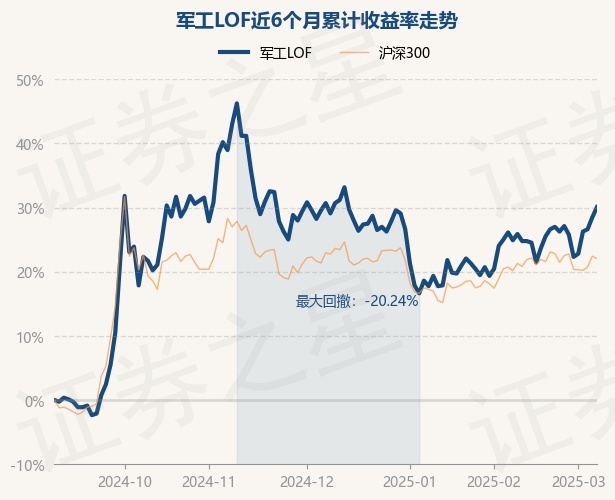 证券之星消息,3月7日,军工LOF最新单位净值为1.055元,累计净值为1.736元,较前一交易日上涨1.25%。历史数据显示该基金近1个月上涨4.04%,近3个月下跌0.47%,近6个月上涨30.09%,近1年上涨20.57%。该基金近6个月的累计收益率走势如下图: