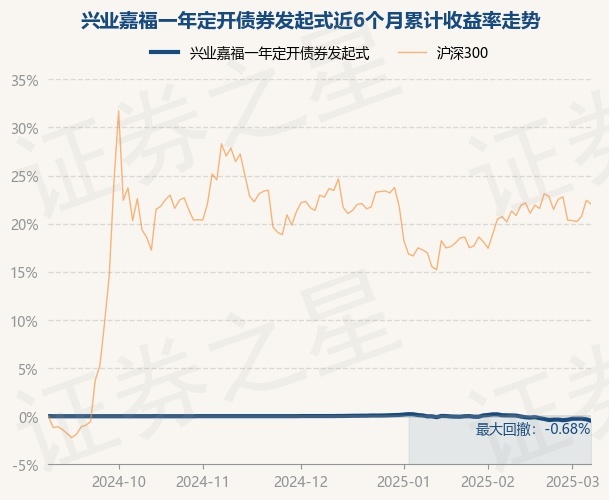 证券之星消息,3月7日,兴业嘉福一年定开债券发起式最新单位净值为1.0615元,累计净值为1.1601元,较前一交易日下跌0.15%。历史数据显示该基金近1个月下跌0.66%,近3个月下跌0.49%,近6个月下跌0.48%,近1年上涨5.24%。该基金近6个月的累计收益率走势如下图: