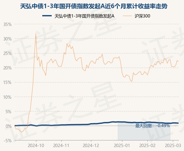 证券之星消息,3月7日,天弘中债1-3年国开债指数发起A最新单位净值为1.0177元,累计净值为1.1269元,较前一交易日下跌0.07%。历史数据显示该基金近1个月下跌0.35%,近3个月上涨0.16%,近6个月上涨0.84%,近1年上涨2.46%。该基金近6个月的累计收益率走势如下图:
